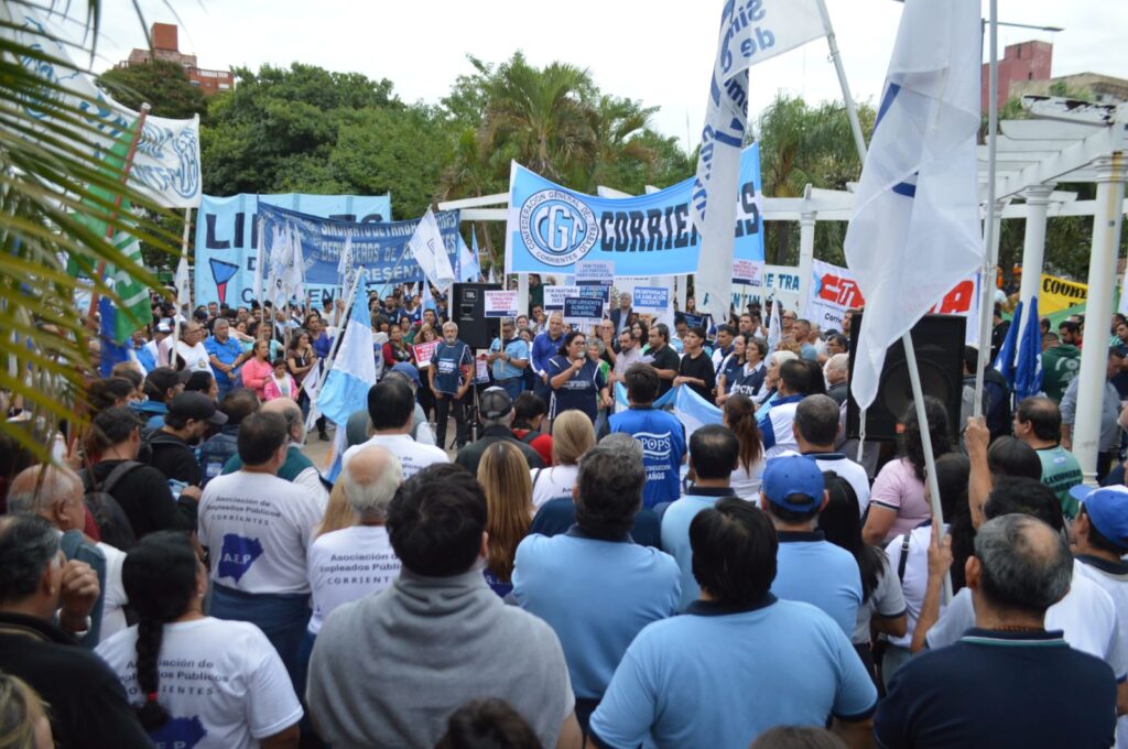 En la céntrica plaza Juan de Vera de la Capital congregaron en un acto multitudinario trabajadores estatales y del sector privado para expresar su rechazo a las “políticas de ajuste económico y exclusión social que lleva adelante el presidente Javier Milei, con la explícita complicidad de sus aliados electorales y parlamentarios como el gobierno provincial de Gustavo Valdés que replica en Corrientes idénticas medidas”, expresaron.