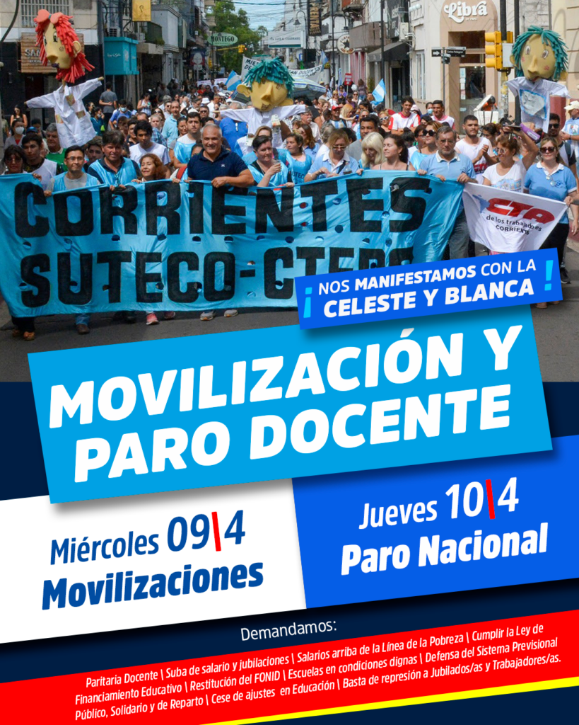 El 9 de abril los docentes de Corrientes, junto a trabajadores de otros sectores, se movilizarán en la Capital provincial y en localidades del interior defensa de la educación pública, de los estudiantes y de los jubilados. Habrá asambleas, marchas, protestas, radio abierta, clases públicas.