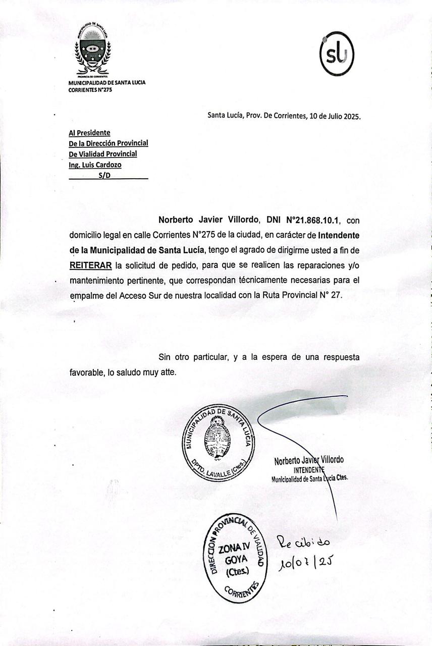 El Intendente de Santa Lucía, Norberto Javier Villordo, elevó esta semana una nota formal dirigida a la Dirección Provincial de Vialidad, reiterando el pedido de reparación y mantenimiento del empalme del Acceso Sur de la ciudad con la Ruta Provincial N° 27.