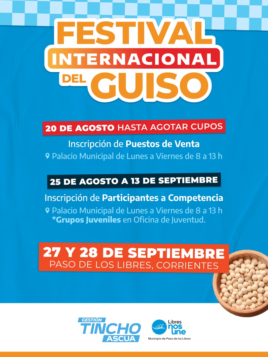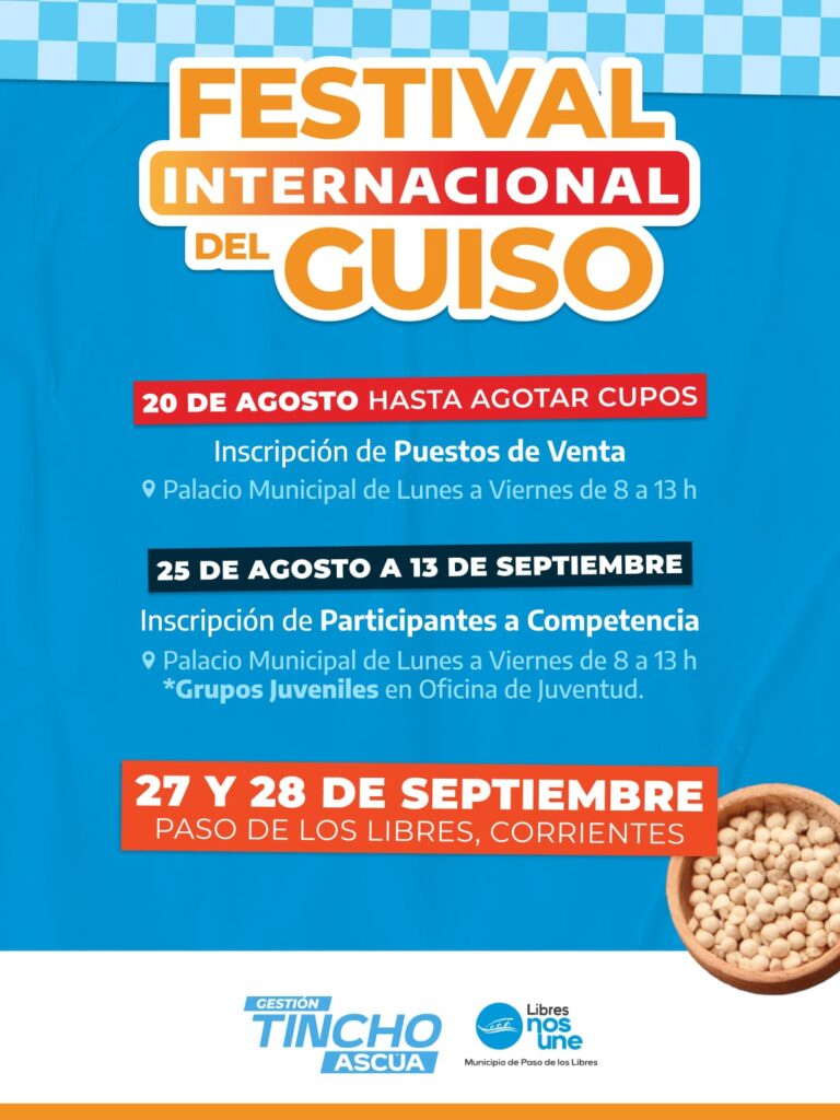El Municipio de Paso de los Libres informó que se habilitaron las inscripciones a aquellos interesados en ocupar lugares de puntos de venta durante la 27° edición del Festival Internacional del Guiso que se realizará los días 27 y 28 de septiembre con entrada libre y gratuita.